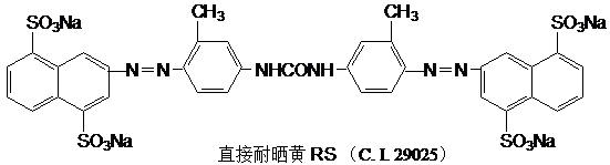 二芳基脲分子中的C-N具有部分双键的特性,整个染料分子也倾于保持平面性。但取代脲基团又为一隔离基团,将整个分子分隔成为两个独立的发色团共轭体系。染料的耐光性能优良,一般具有较好的日晒牢度。其色泽以黄、橙、红、蓝等色为主,结构举例如下: