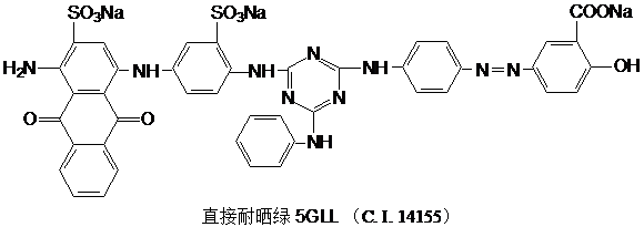 这类染料在分子结构中含有三聚氰胺结构,对纤维素纤维具有很好的亲和力,日晒牢度也好,但是品种不多,一般只有绿、红和蓝三种颜色。它们是由三聚氯氰与具有氨基的染料或芳香胺缩合而成。一般在染料合成中,绿色较难合成,而这类染料可通过隔离基连接黄和蓝两种染料而合成绿色染料,且应用简便。结构举例如下: